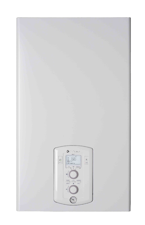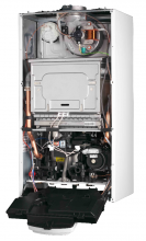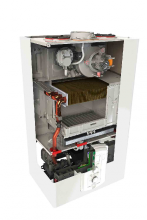 Nástěnný plynový kotel s průtokovým ohřevem vody a mikroakumulací.